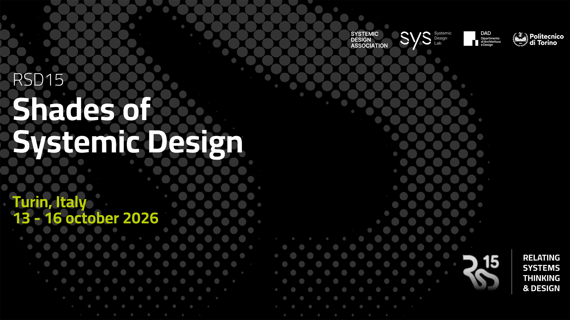 Join us at RSD15, the 15th Relating Systems Thinking and Design Symposium organised by Systemic Design Association and hosted by Sys – Systemic Design Lab at Politecnico di Torino. This year’s theme, “Shades of Systemic Design”, explores how design engages with complex societal and ecological challenges through a plurality of approaches, contexts and ways of knowing.